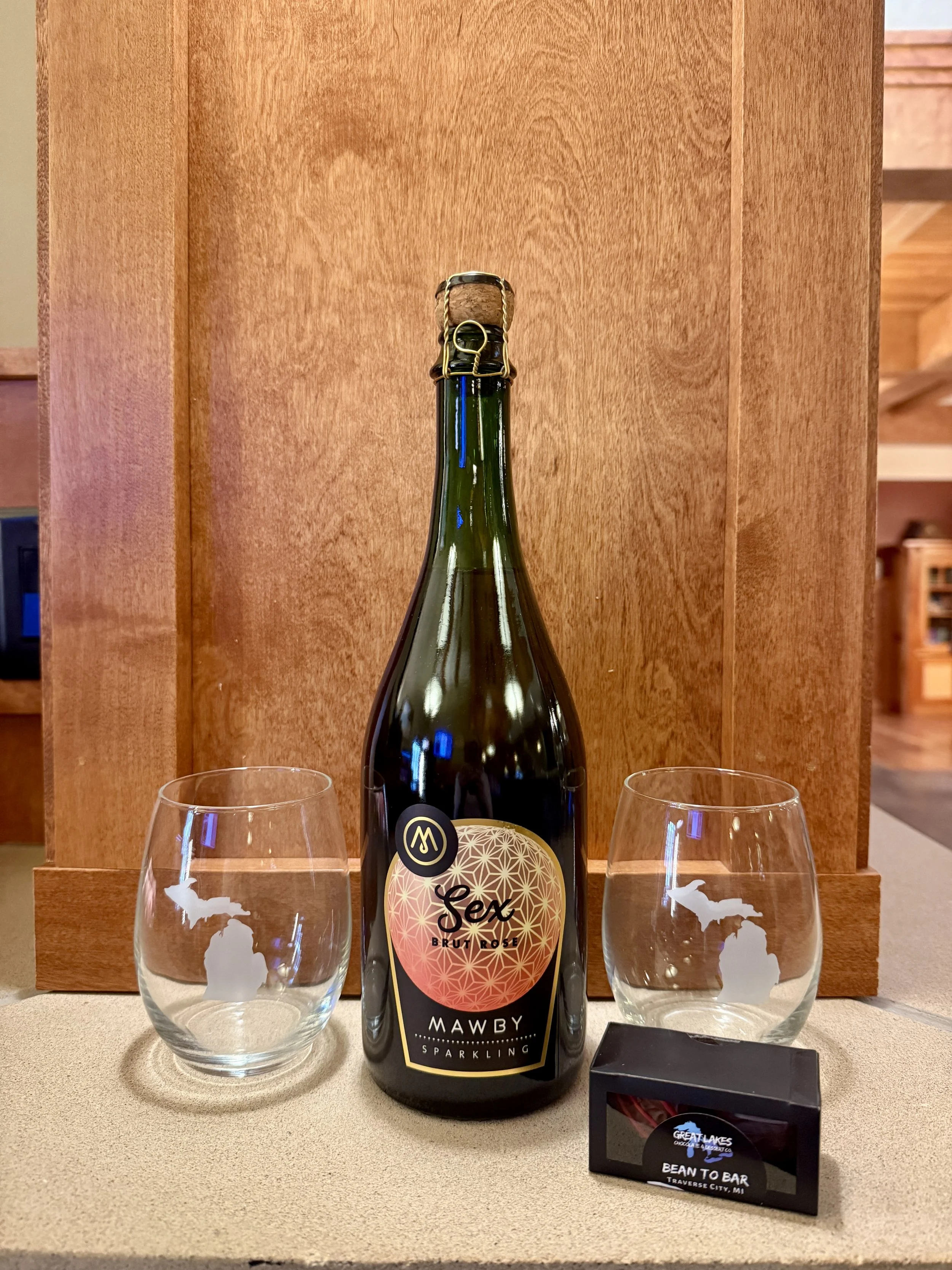 Our Lakefront Romance Package includes a bottle of MAWBY Sex Brut Rosé, a locally produced sparkling rosé from Northern Michigan’s renowned Leelanau Peninsula winery, paired with two tasting glasses and handcrafted local chocolate truffles from Great Lakes Chocolate & Dessert, a beloved Traverse City chocolatier.